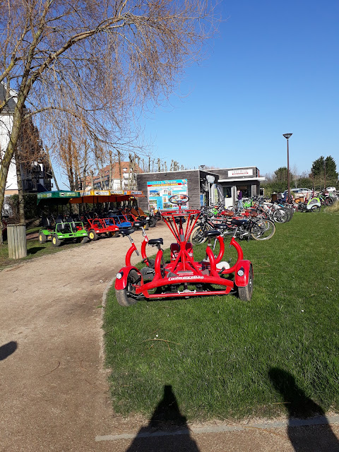 We were sad to head for home the next day and had plans to stop in Rouen, but instead detoured to a beach town near the Black Cow Cliffs (called Falaise des Vaches Noires) we followed the highway sign that showed a fossil and a sea shell. The sea shells were what lured me in but the big surprise was finding this bike rental place next to a dinosaur museum. They rented every kind of bike rig you could imagine.